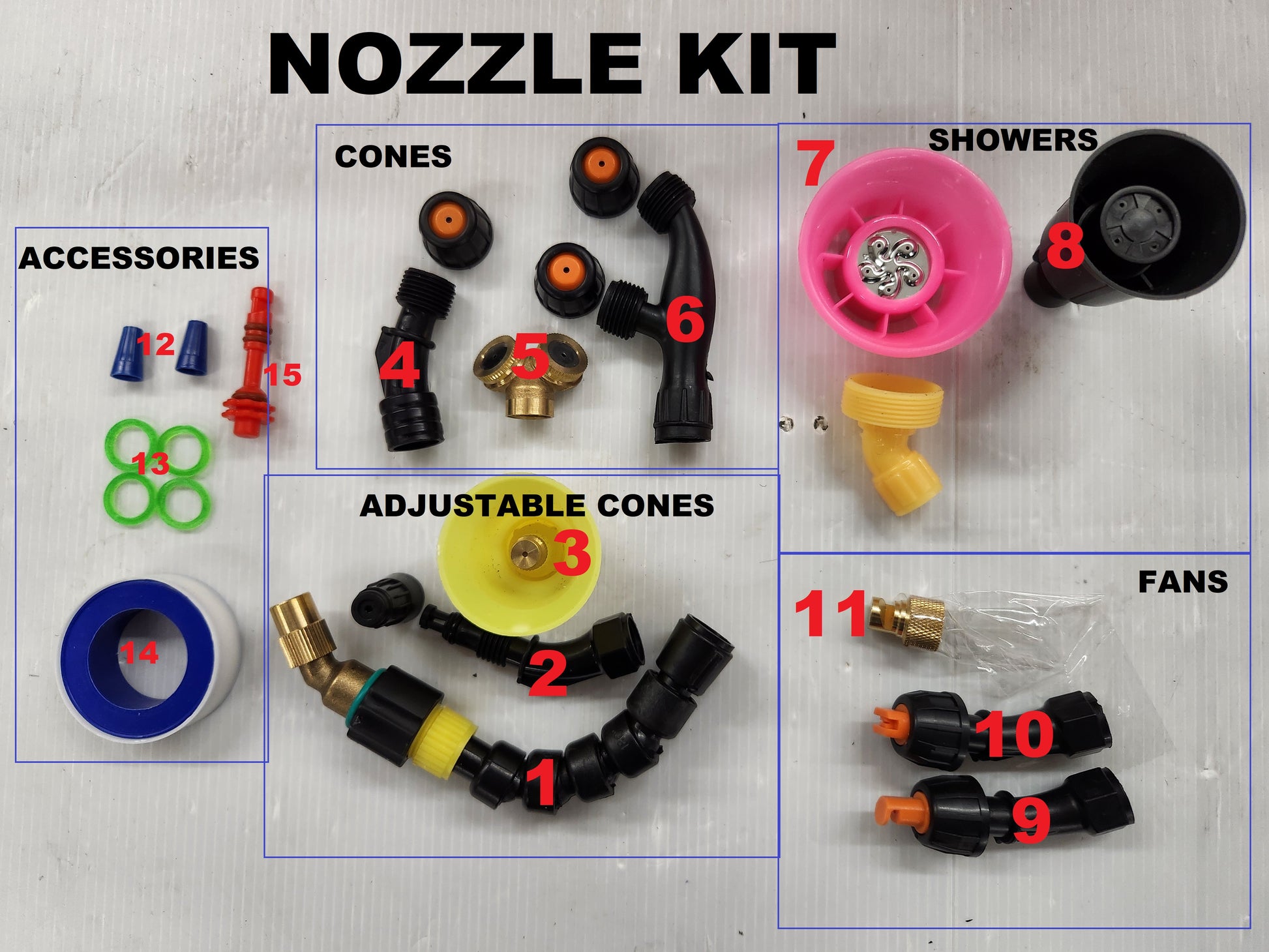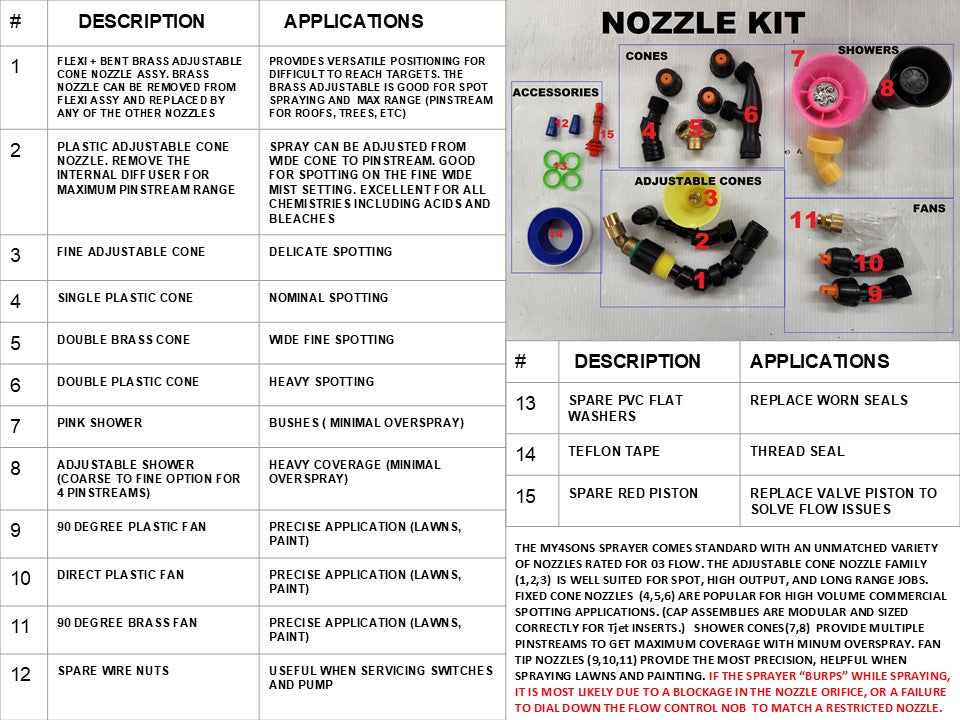 - Ten different nozzles including adjustable brass cone, fan, fog, and a flexible 90 degree nozzle great for reaching those impossible to reach spots.